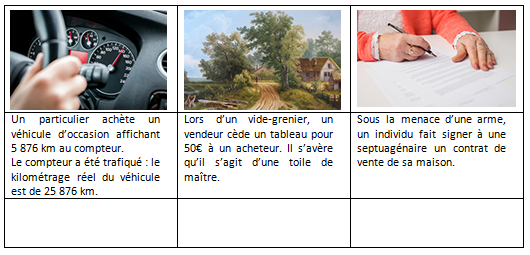 12. Indiquez pour chacun des trois exemples suivants s'il s'agit d'un consentement donné par erreur, extorqué par la violence ou par dol.