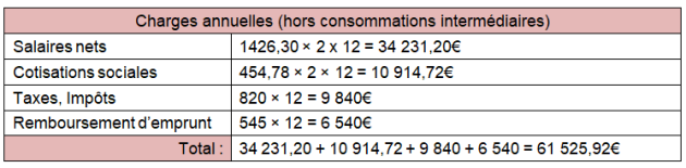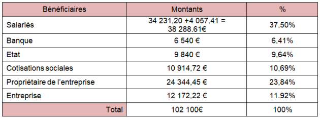 Le chiffre d’affaires correspond aux ventes réalisées (122 500€). La valeur ajoutée correspond au chiffre d’affaires diminué des consommations intermédiaires lors de la fabrication des produits ou de la prestation de services (102 100€). Le résultat (+40 574,08€) correspond à ce qui reste aux propriétaires de l'entreprise après avoir déduit l’intégralité des charges.