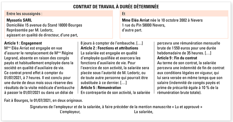 15. Mme Legrand s'est cassé la jambe pendant ses congés : l'entreprise Les Myosotis peut-elle prolonger le contrat d'Eléa d'un mois ? Justifiez votre réponse.
