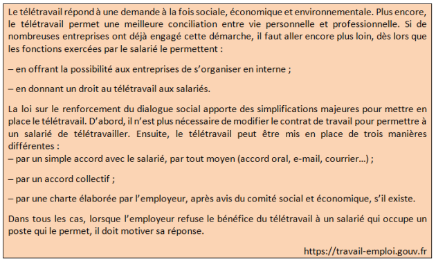 13. Expliquez comment la loi tente de favoriser le télétravail.