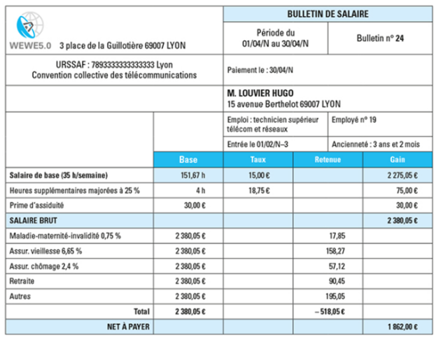 15. À quoi correspond le salaire net que percevra le salarié ? Détaillez votre calcul.